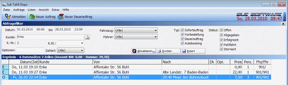 Hier haben Sie die Möglichkeit, alle erfassten Aufträge nach Ihren Kriterien zu suchen und nachzuvollziehen. Das Listenfenster ist in die Bereiche Abfragefilter und Ergebnistabelle aufgeteilt. Um Aufträge zu suchen, die aktuell sind oder in der Vergangenheit liegen, stehen ausgewählte Filter zur Verfügung. Die Zeit- und Datumsfelder können Sie, wie im Auftragsfenster auch, in Kurzform eingeben. Nachdem Sie ihre Eingaben gemacht haben, klicken Sie auf Aktualisieren