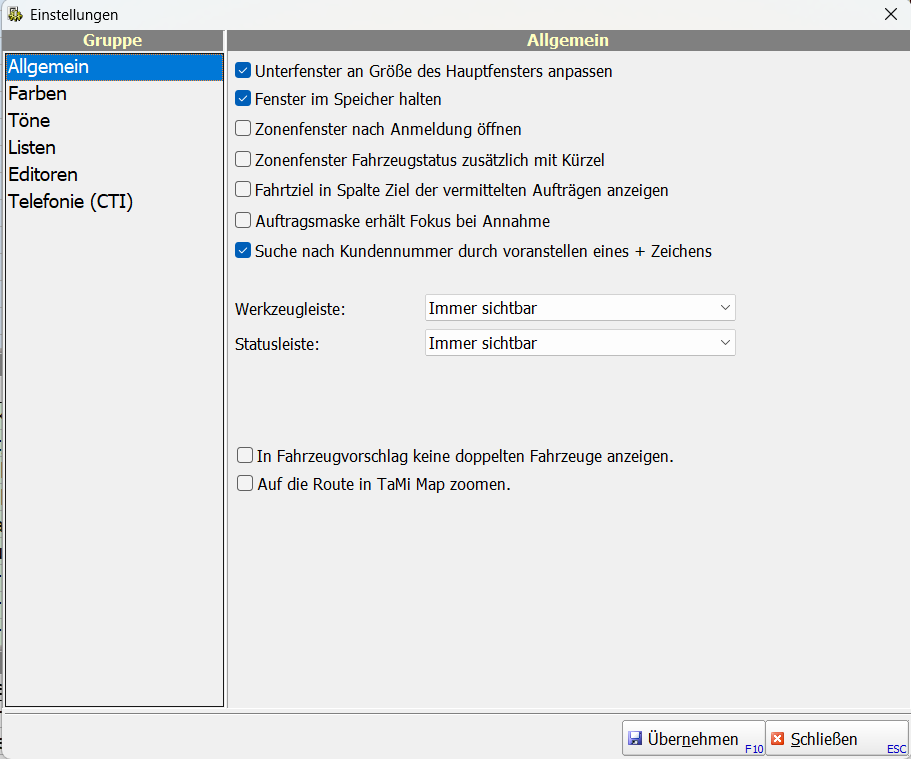 In den Einstellungen innerhalb der Disposition besteht die Möglichkeit, verschiedene Anpassungen vorzunehmen. Dazu gehören unter anderem die Auswahl und Steuerung von Tönen, Farben sowie weiteren Eigenschaften. Diese können je nach Bedarf individuell aktiviert oder deaktiviert werden, um die Benutzeroberfläche und Funktionsweise an die eigenen Anforderungen anzupassen.