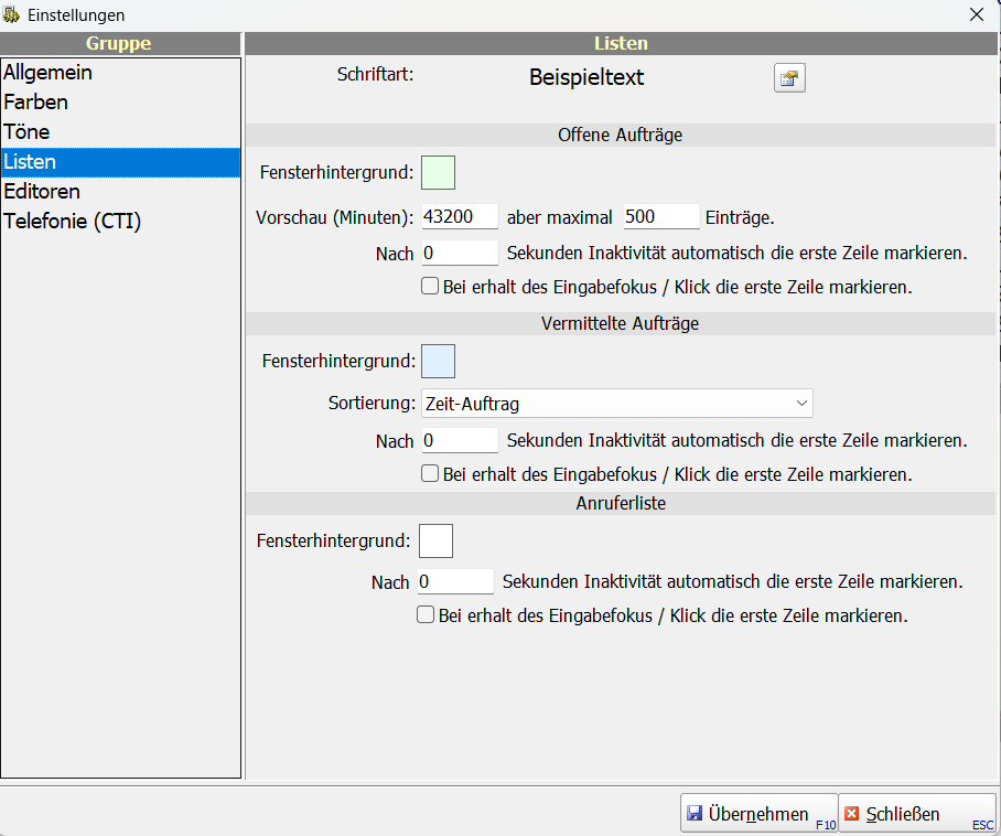 In den Einstellungen kann die Hintergrundfarbe individuell angepasst und die gewünschte Schriftart ausgewählt werden. Darüber hinaus lässt sich festlegen, wie viele Einträge in den offenen oder vermittelten Aufträgen angezeigt werden sollen.