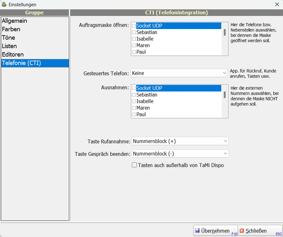 Ist die Telefonanlage im System integriert, kann festgelegt werden, an welchem Arbeitsplatz die Auftragsmaske automatisch geöffnet werden soll. Zusätzlich lässt sich hier auch die Taste definieren, mit der eingehende Anrufe angenommen werden.