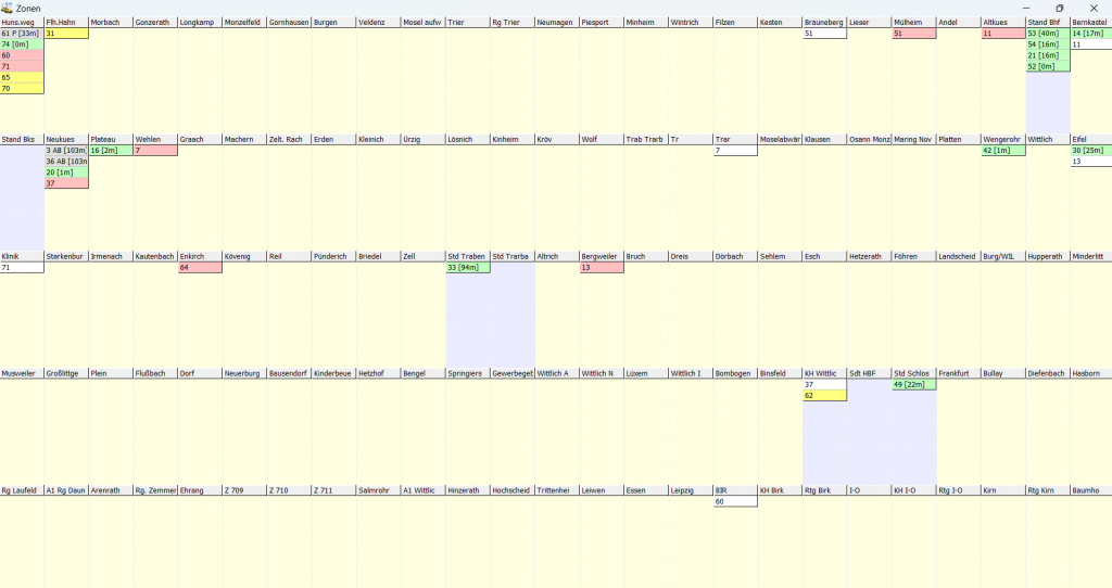 In der Zonenübersicht wird jedes Fahrzeug in der entsprechenden Zone angezeigt. Die Arbeit mit Zonen ist besonders sinnvoll, da auf einen Blick ersichtlich ist, wie lange sich ein Fahrzeug bereits in einer Zone befindet – die Aufenthaltsdauer wird in Minuten angegeben. Zusätzlich wird der aktuelle Status des Fahrzeugs dargestellt, also ob es frei oder besetzt ist. Dieser Status wird, analog zur Darstellung in der Karte, durch unterschiedliche Farben gekennzeichnet, sodass man jederzeit eine klare Übersicht über die Situation hat.