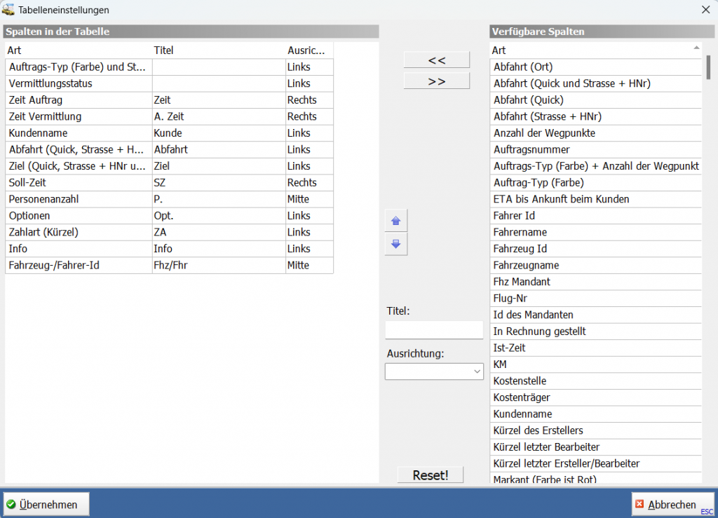 Wählen Sie die gewünschte Spalte aus und fügen Sie diese mithilfe der Pfeiltasten hinzu oder entfernen Sie sie entsprechend. Anschließend müssen Sie die vorgenommenen Änderungen speichern, damit die Anpassungen wirksam werden.