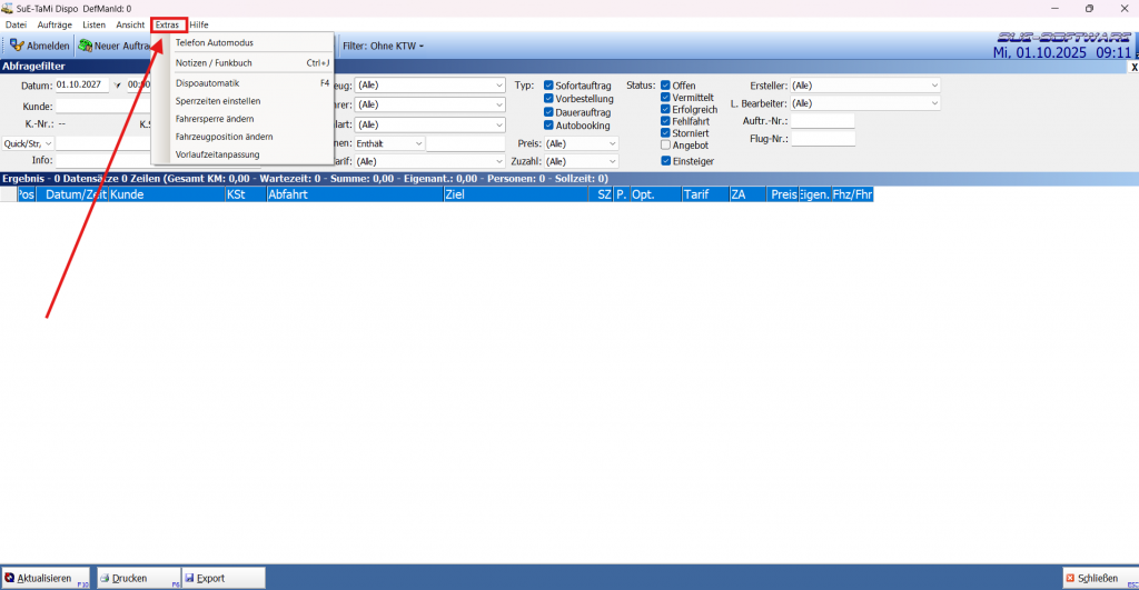 Im Menüpunkt ‚Extras‘ stehen erweiterte Funktionen zur Verfügung wie z. B. ein Telefon-Automodus, eine automatische Disposition oder die Möglichkeit, Sperrzeiten für bestimmte Situationen festzulegen. Der Modus kann durch Anklicken aktiviert werden (Häkchen = Aktiv)