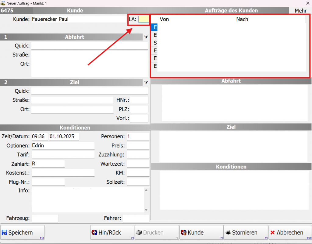 Wenn Sie Daten in ein Feld eingeben, erscheint auf der rechten Seite der Auftragsmaske häufig eine Schnellauswahl. Diese zeigt Einträge aus früheren Aufträgen oder der Datenbank an, die zu Ihren Eingaben passen.