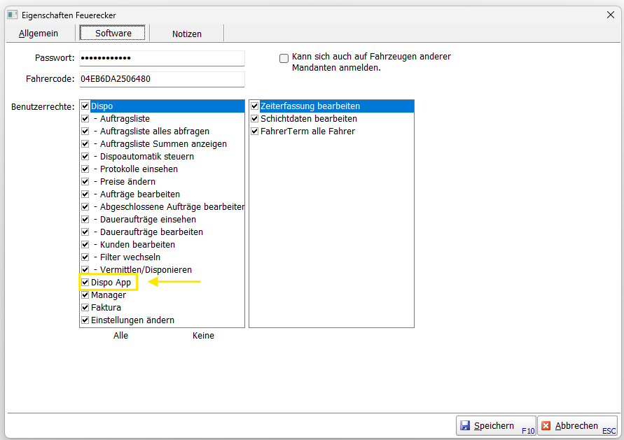 Mit dieser Berechtigung können Aufträge vermittelt und auch storniert werden. Geben Sie den Zugang daher nur an Mitarbeiter weiter, die tatsächlich für die Disposition zuständig sind. Ein Zusätzliches Passwort muss auch angelegt werden.
