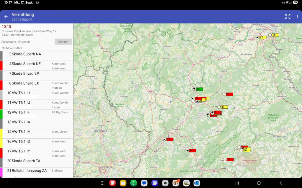 Um einen Auftrag an ein bestimmtes Fahrzeug zu übergeben, tippen Sie in der oberen Leiste der App auf das Flugzeug-Symbol. Daraufhin öffnet sich die Vermittlungsmaske inklusiver der Überblickskarte. In dieser Ansicht sehen Sie nicht nur die Auftragsdetails, sondern auch eine integrierte Kartenübersicht, die Ihnen zeigt, welche Fahrzeuge aktuell verfügbar sind. So erhalten Sie auf einen Blick eine klare Übersicht über den Standort und den Status Ihrer Flotte.
